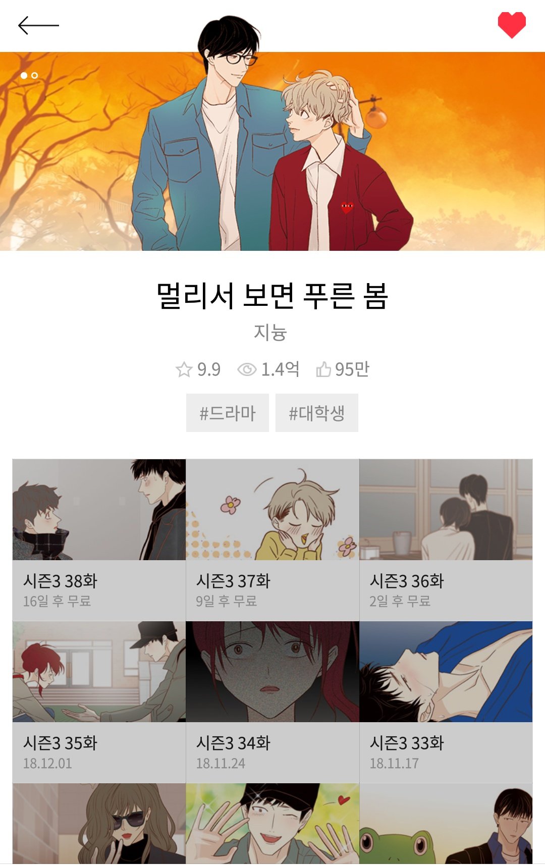 멀리서 보면 푸른 봄 Bl : íì´ ëì±ì ì¸ê¸° ì¹í° ë"ë¼ë§ 주ì¸ê³µ ë ¼ì ì¤'ì´ë¼ë" ìì´ë ìí¤í¸ë¦¬ : 드라마 '멀리서 보면 푸른 봄' 제작발표회 출근길!play 5.. 2 903 отметок «нравится», 123 комментариев — 빅토리콘텐츠 (@victorycontents) в instagram: 그러나 포기하지 않고 라온과 친해지기 위해 끈질긴 스토킹을 하는데. 멀리서 보면 푸른 봄은 대한민국의 만화가 지늉의 연재중인 웹툰이다. Blue spring / 멀리서 보면 푸른 봄 / from afar, a springtime. 그런데 푸른 피입니다. 고아인 줄 알았던 그녀가 칼리스토 공작가에서 천 년.